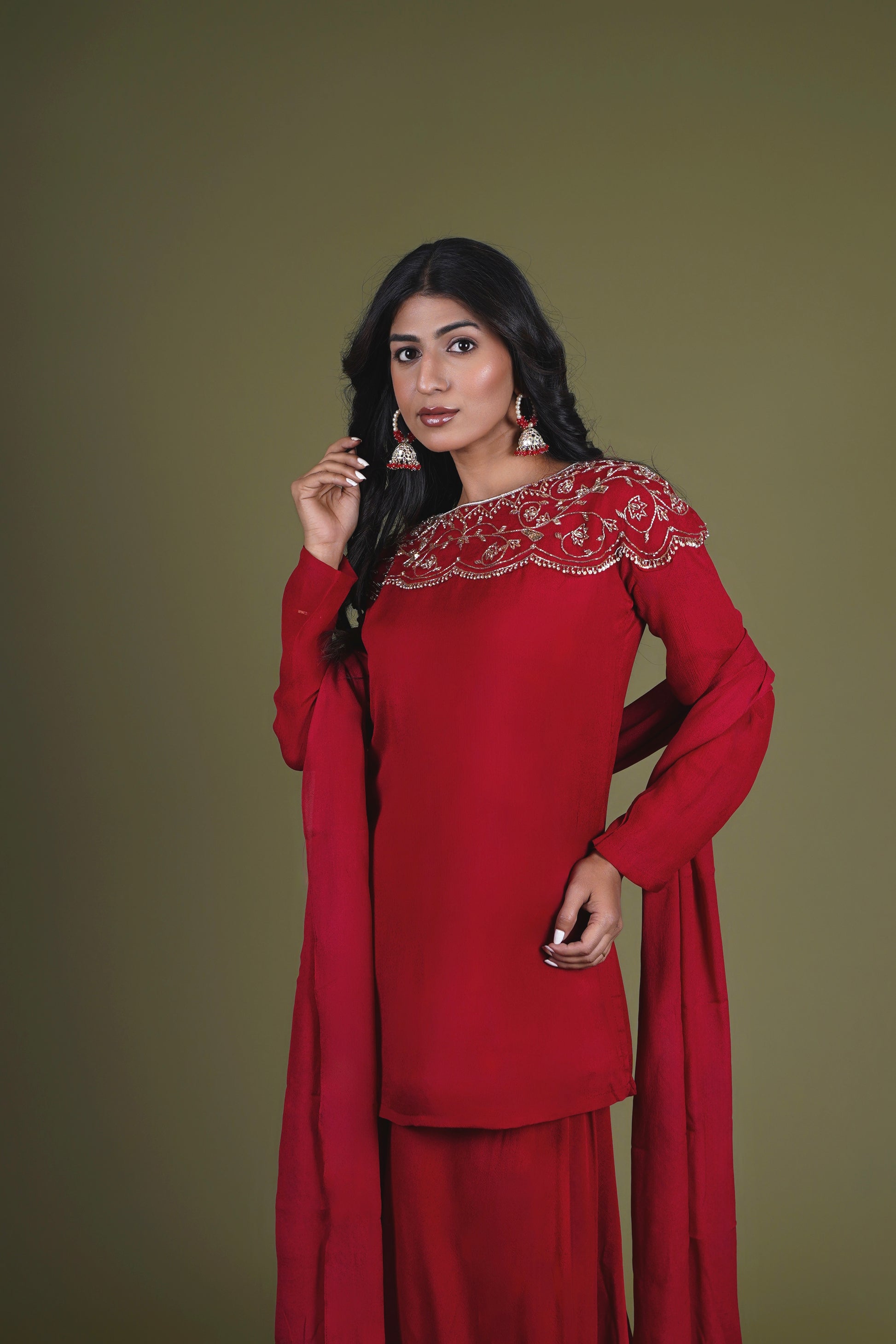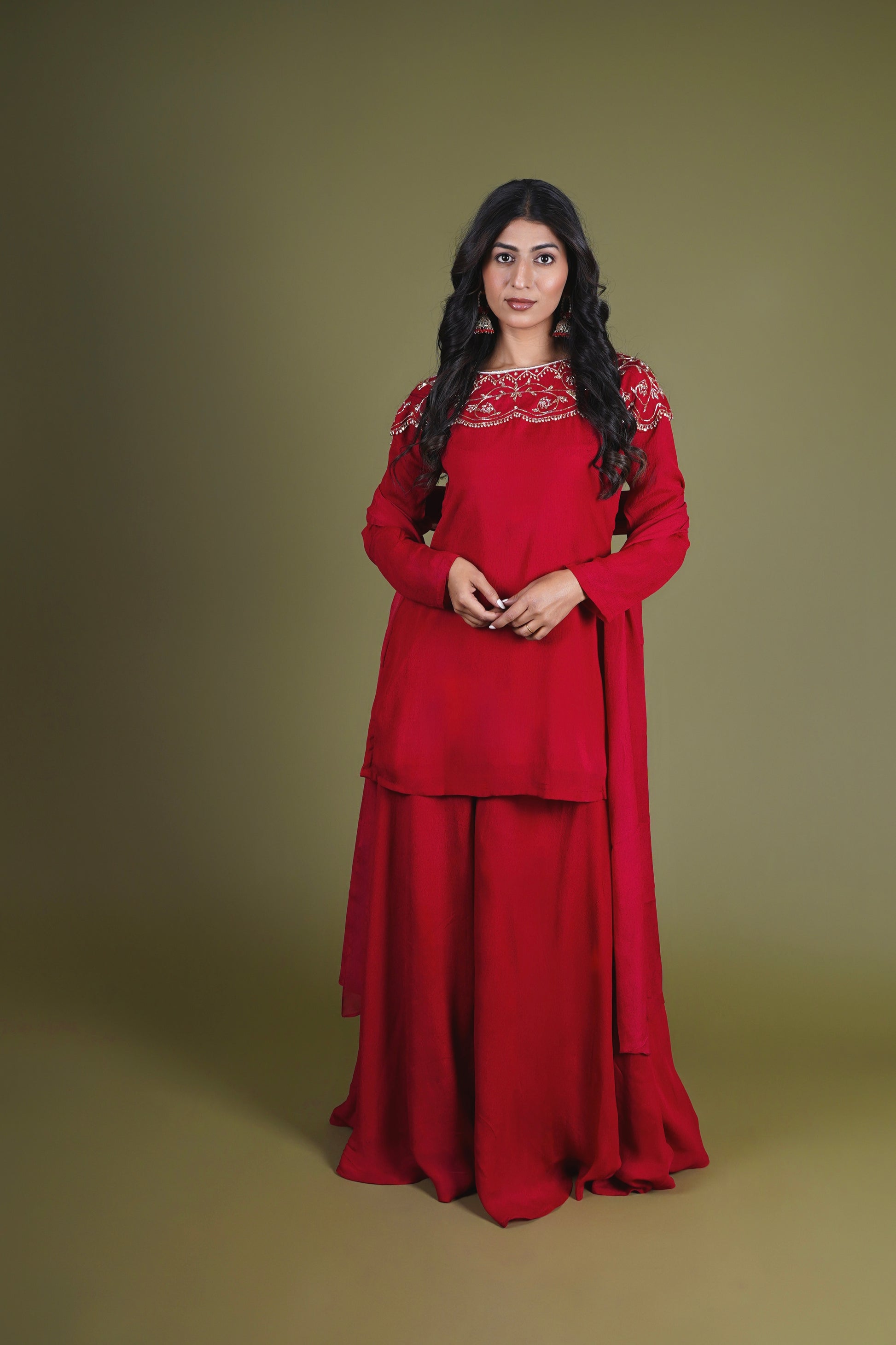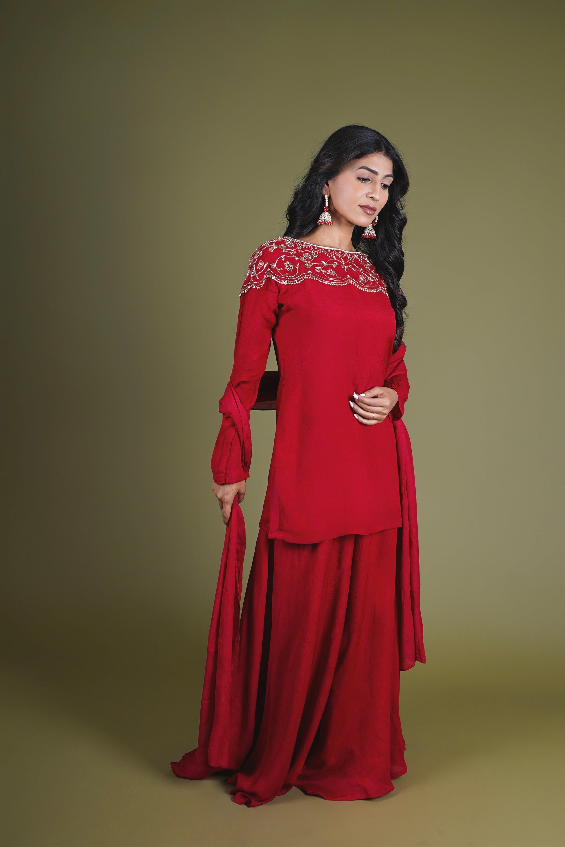 Red Hand Embroidered Palazzo Suit With Dupatta