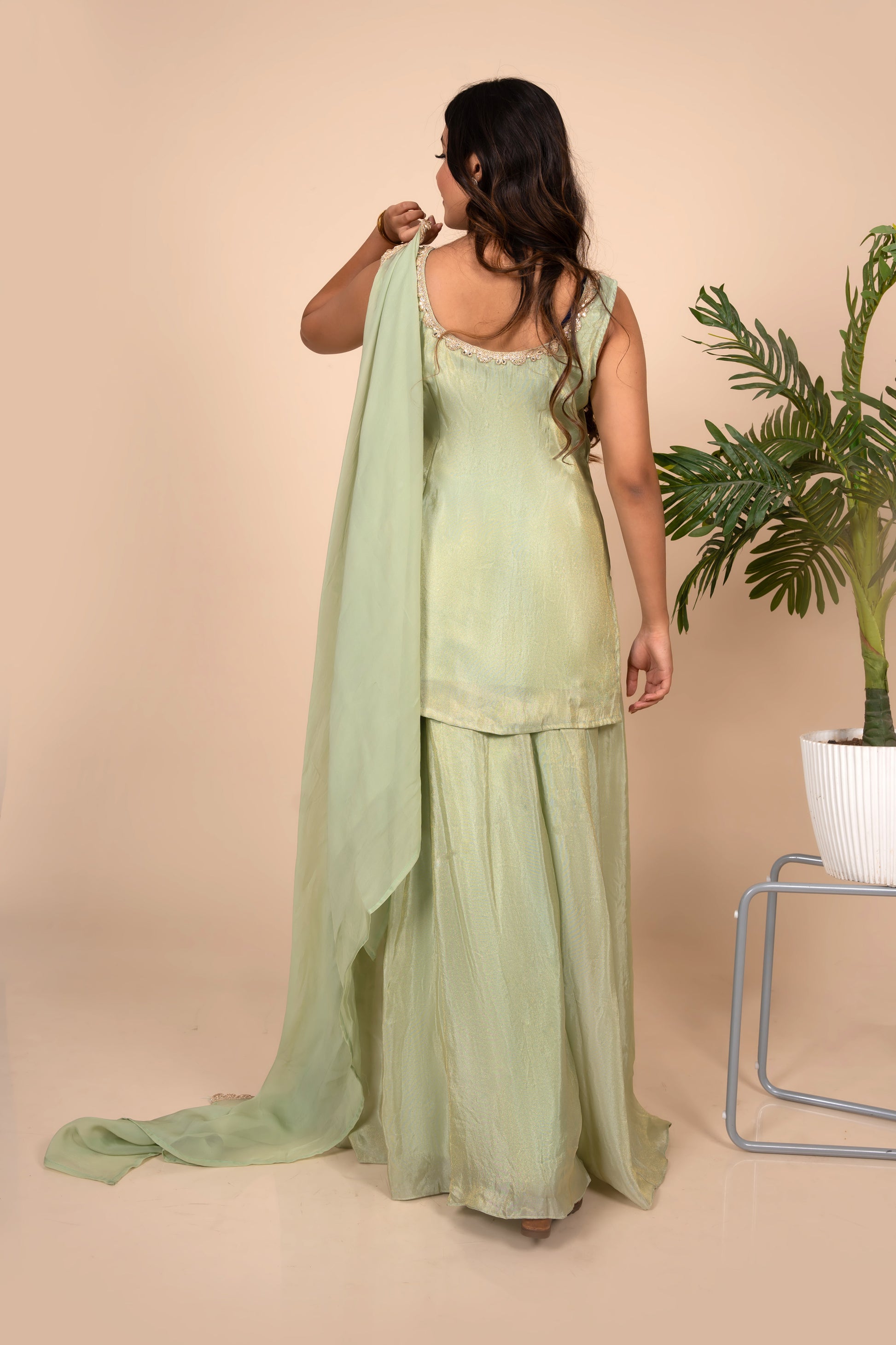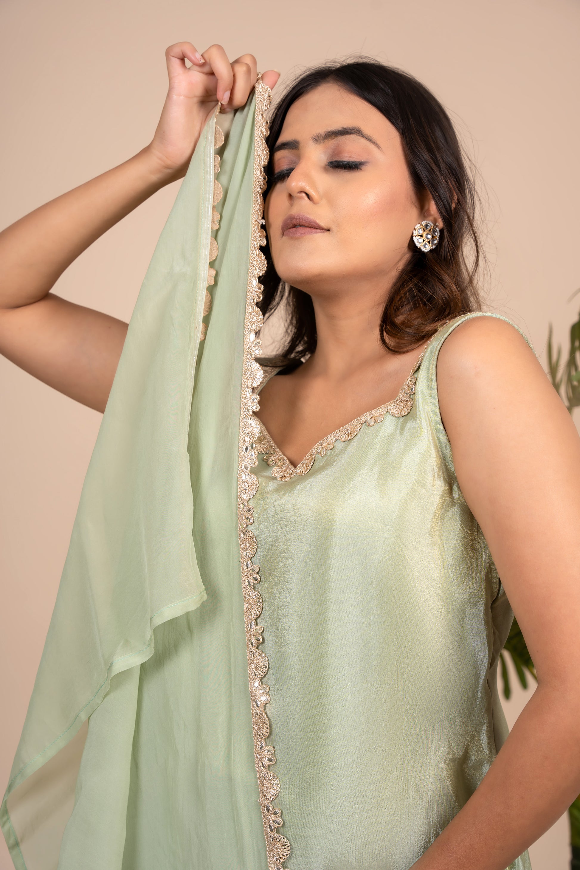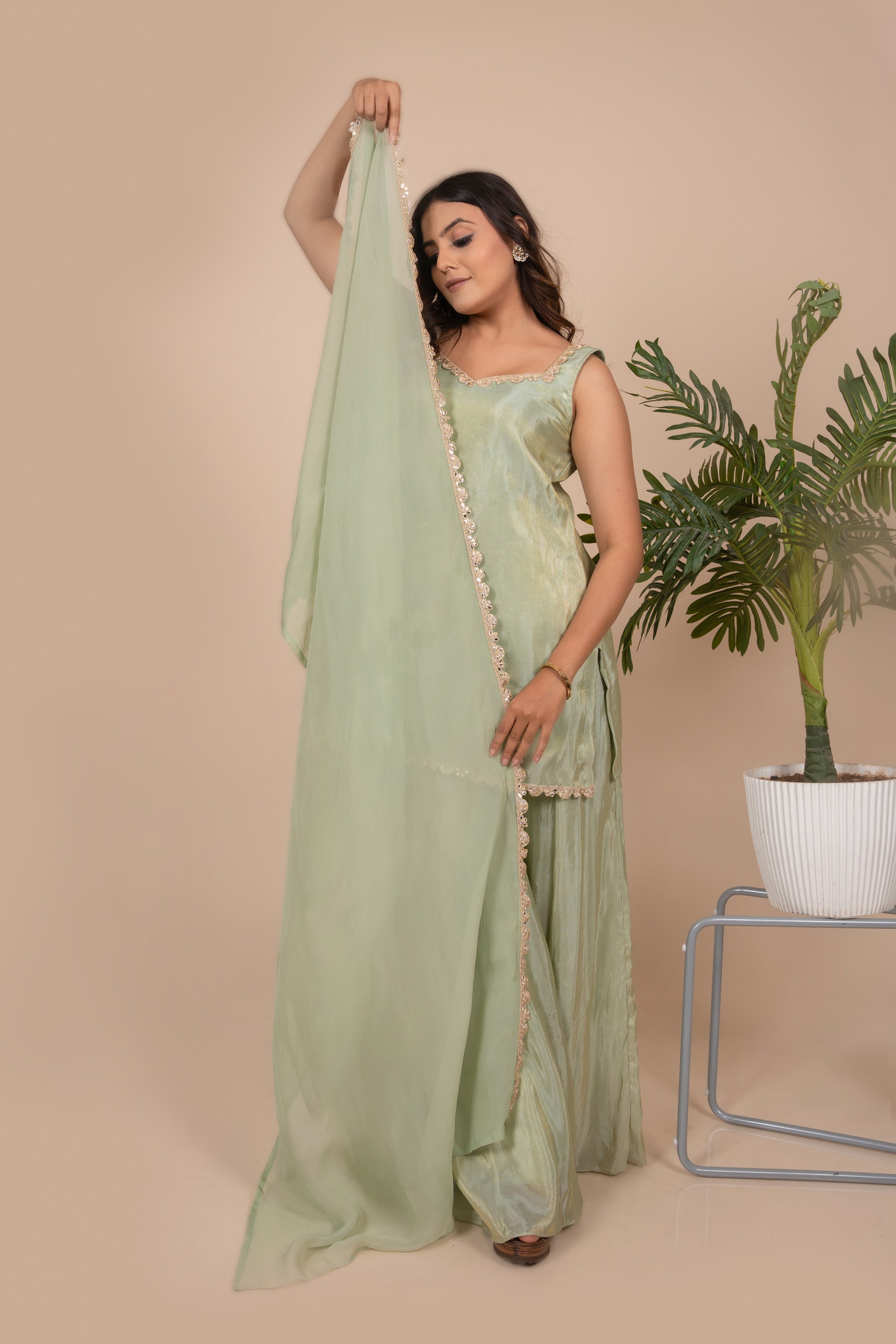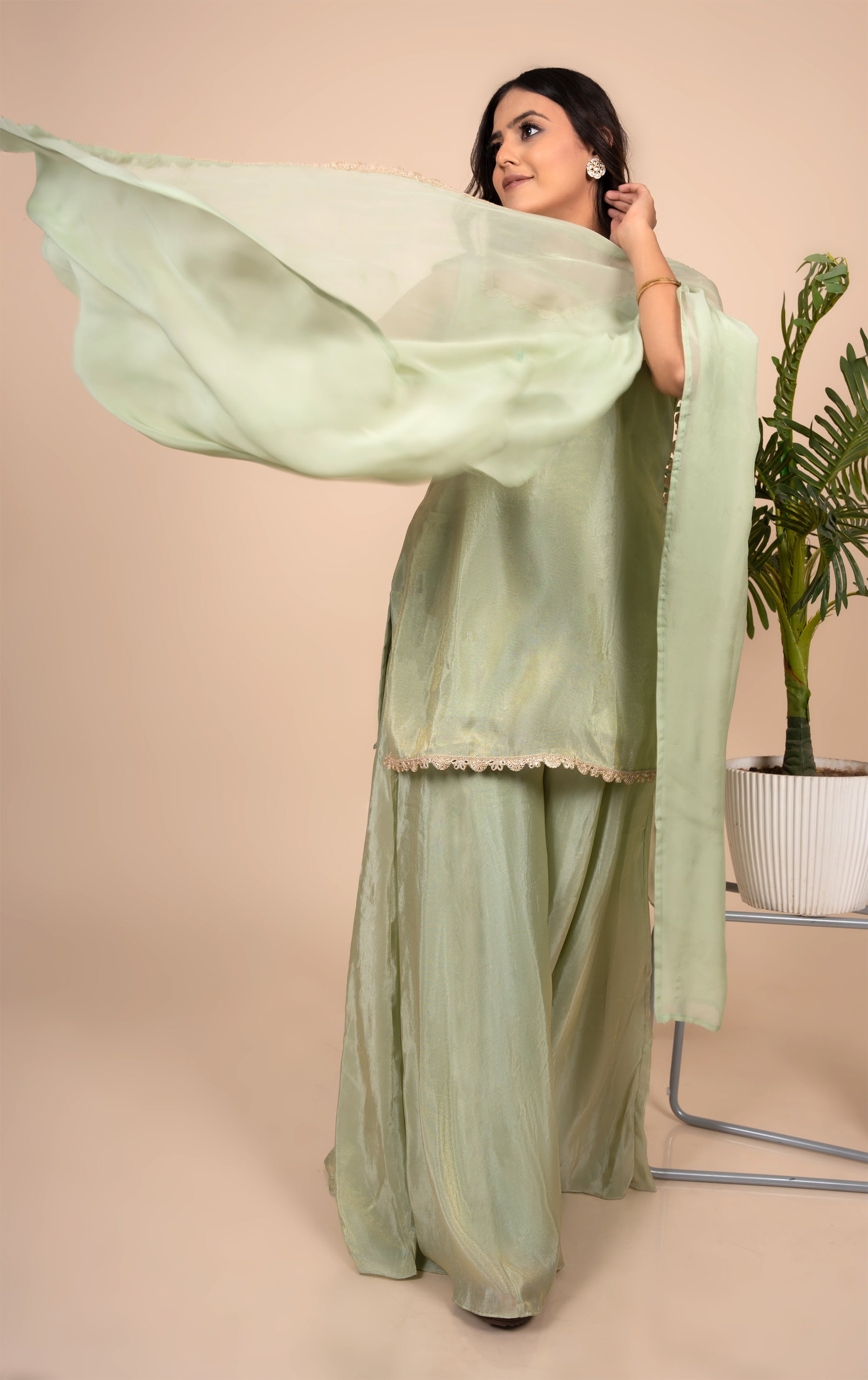 Step into elegance with this stunning kurta-palazzo set accompanied by a graceful dupatta adorned with intricate gota lace detailing. The kurta boasts exquisite craftsmanship, featuring delicate gota lace accents along the neckline, hemline, and the back, adding a touch of regal charm to the ensemble. Paired with comfortable palazzos, this ensemble offers both style and comfort, perfect for any festive occasion or cultural celebration.