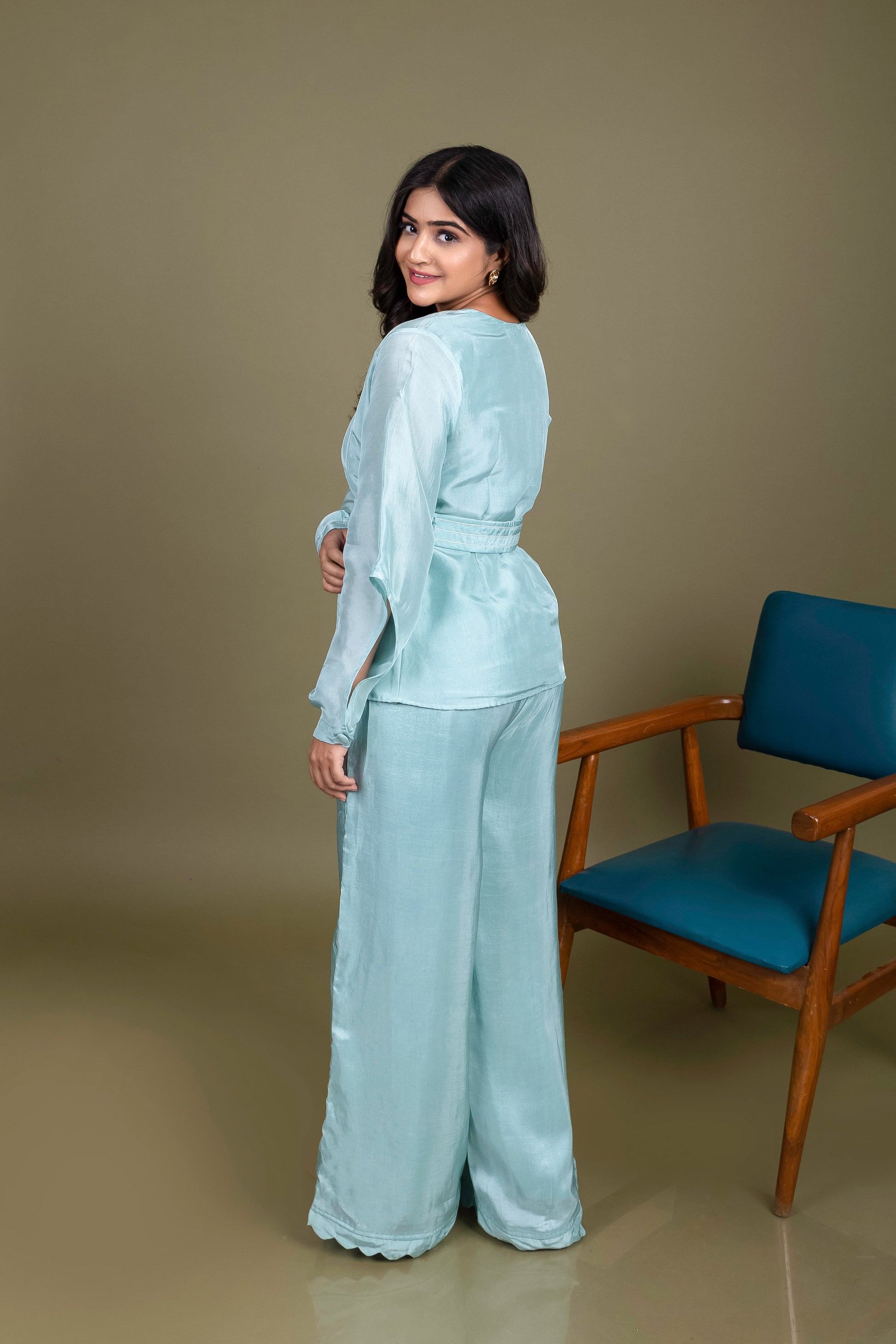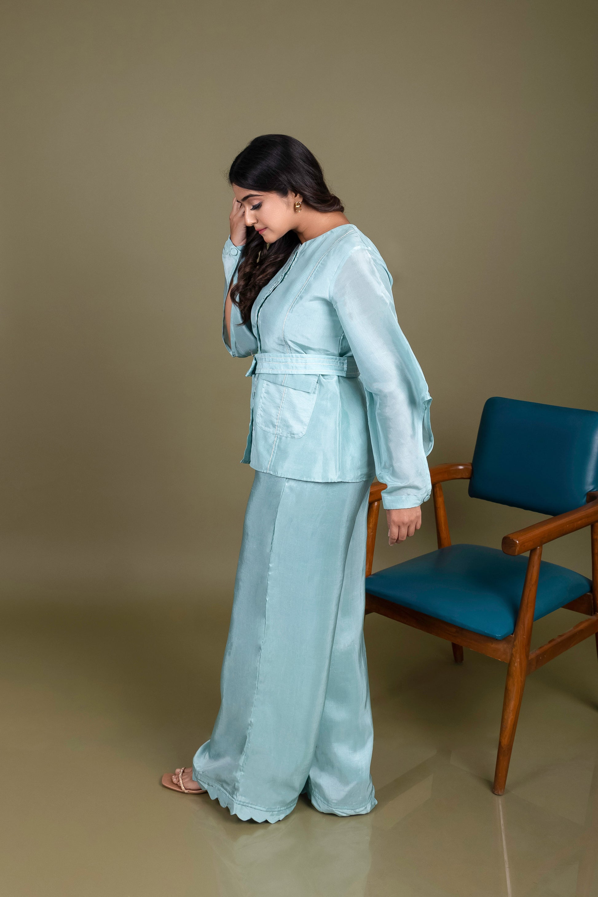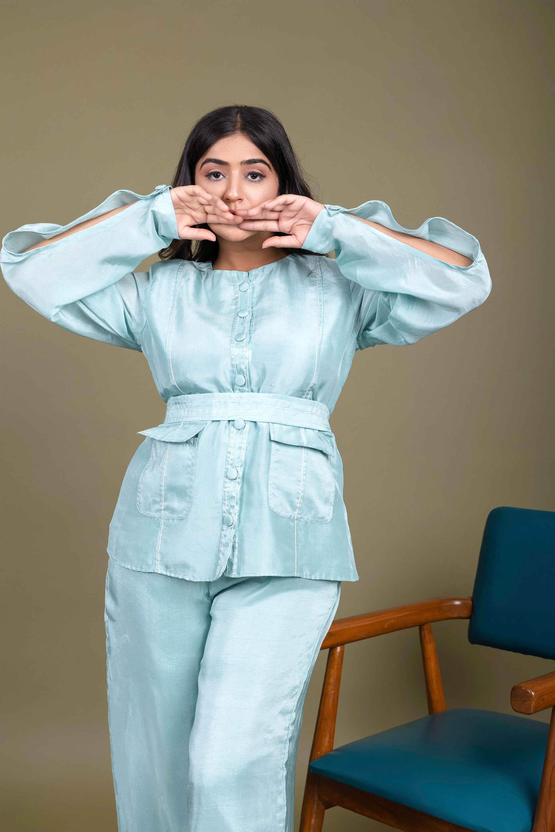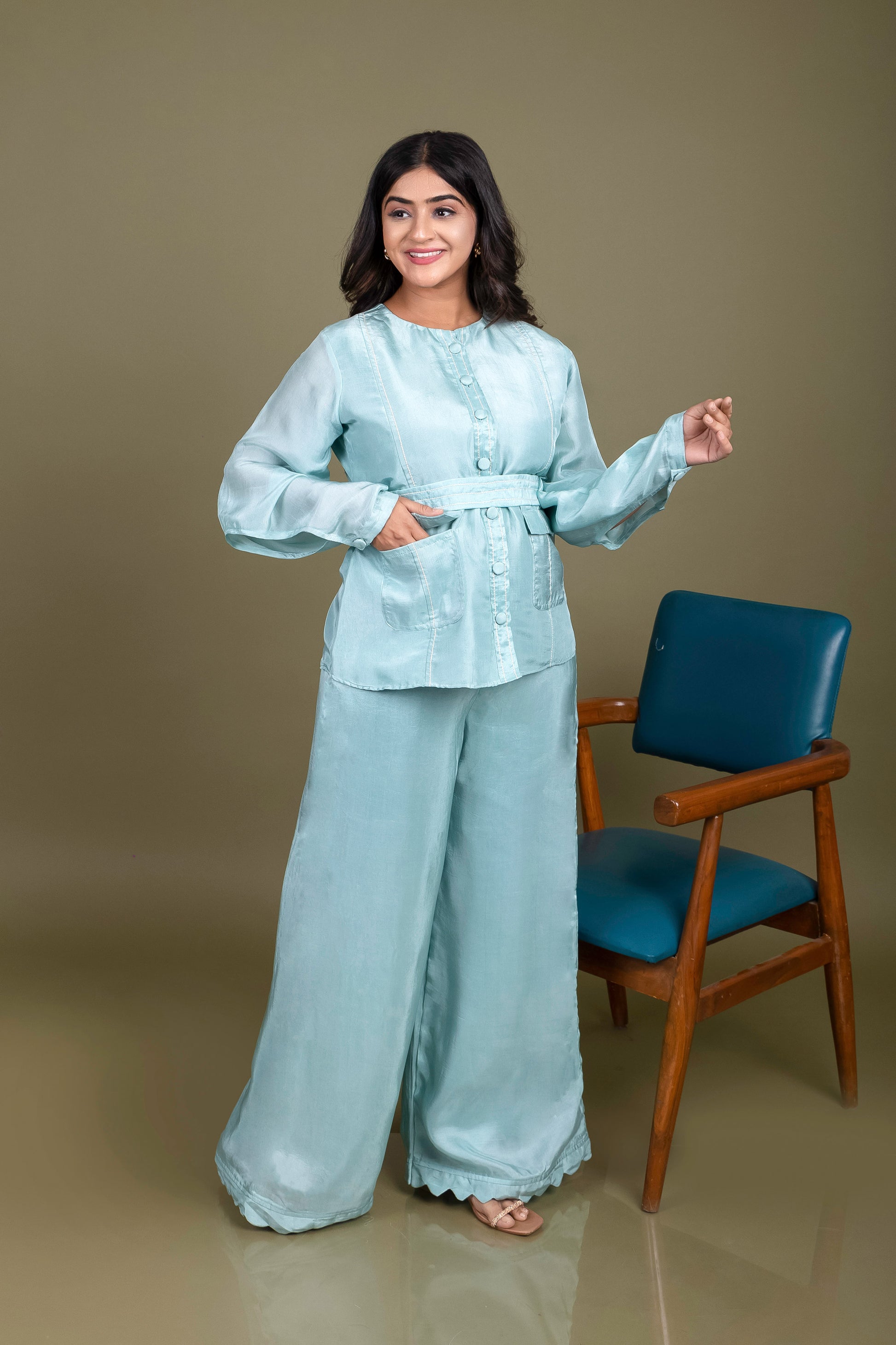 This chic blue co-ord set exudes a blend of elegance and modern style. The top features intricate thread anchoring, adding a touch of detailed craftsmanship and visual interest. Complementing the top is a matching belt, also adorned with thread anchoring, which cinches the waist for a flattering silhouette. This coordinated ensemble is perfect for making a sophisticated statement with its cohesive design and meticulous detailing.