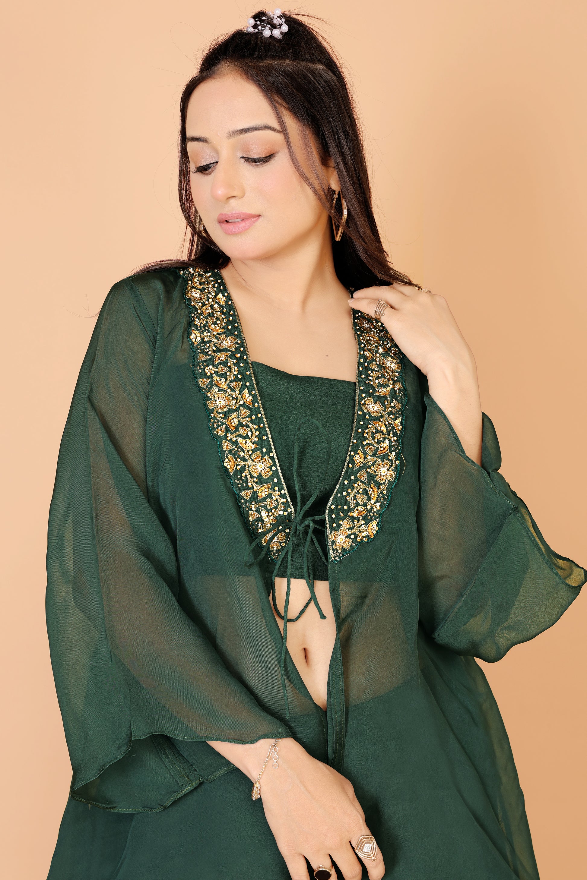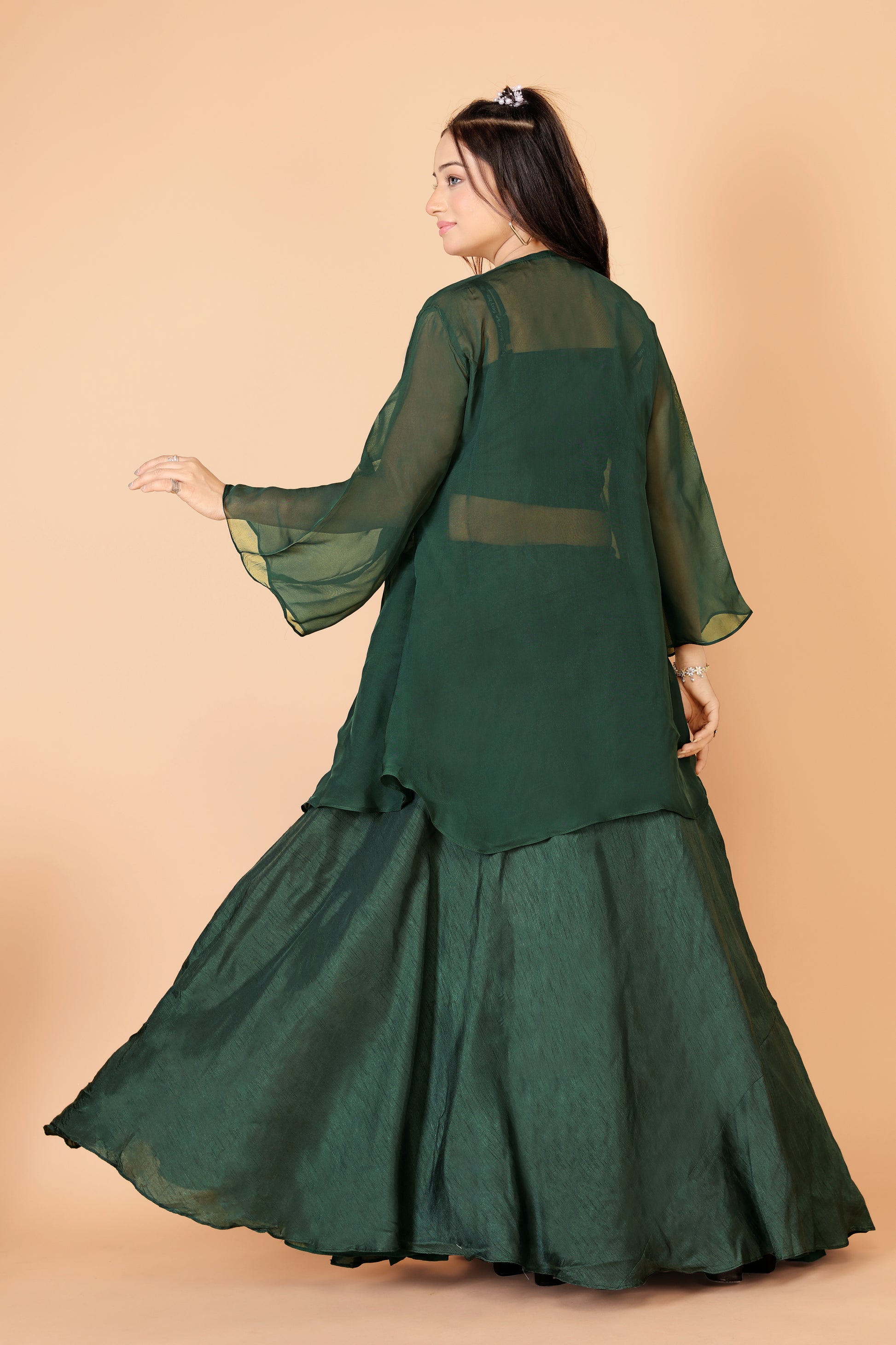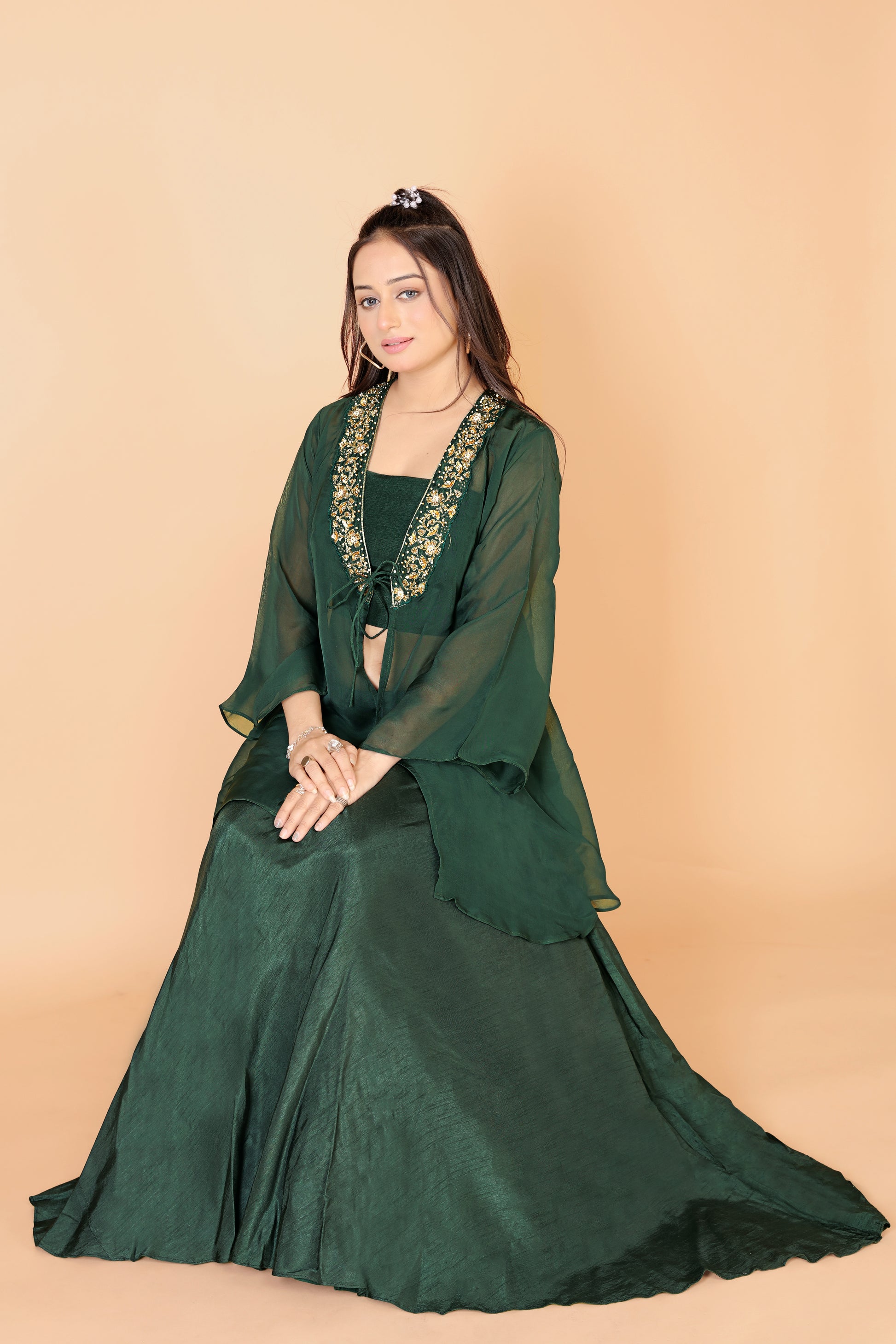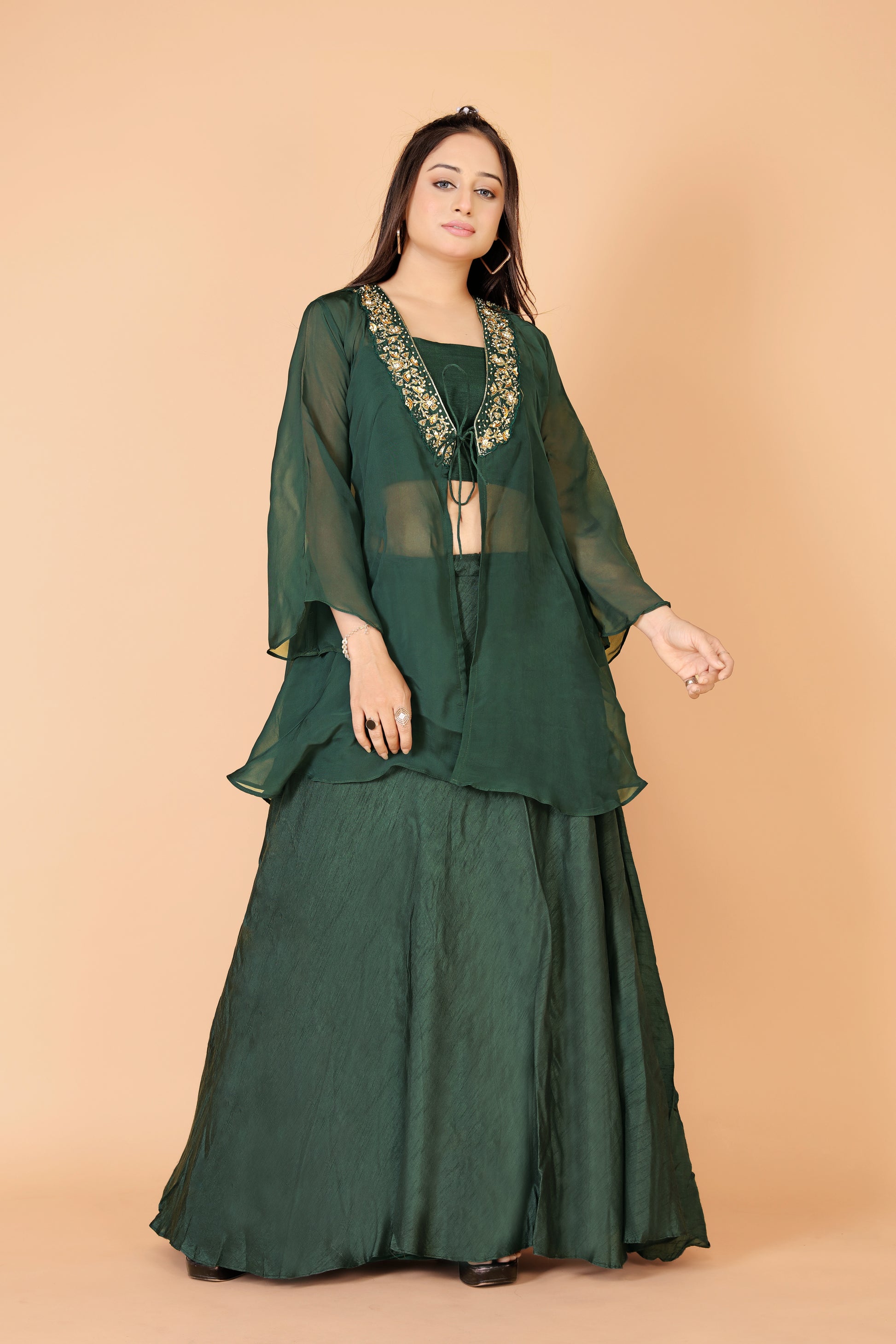 Tarz's Bottle Green Skirt Croptop with Embroidered Short Jacket