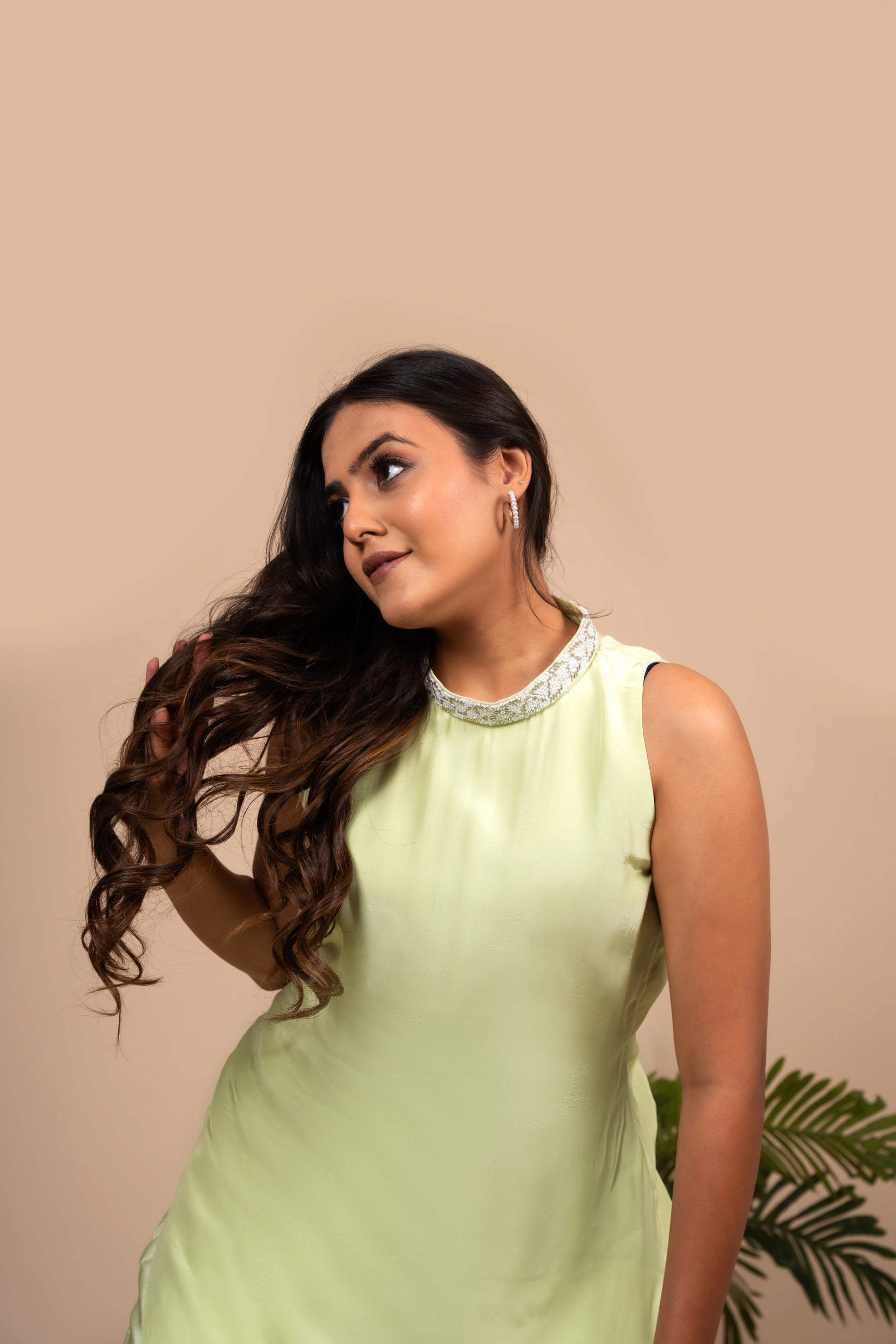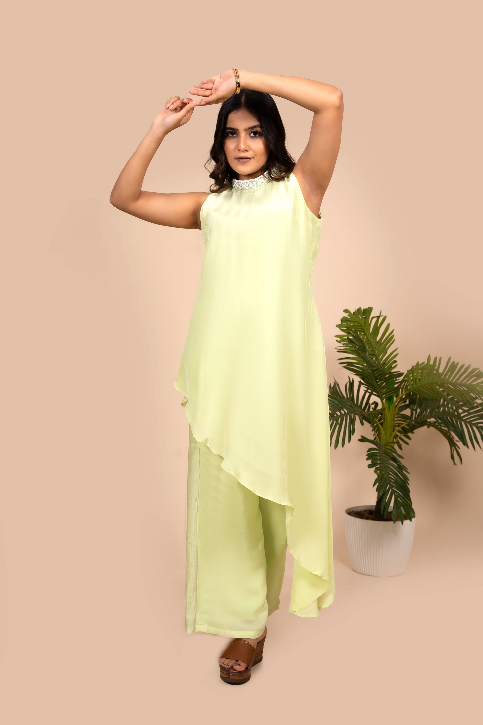 This co-ord set radiates sophistication with its pearl hand embroidery delicately adorning the collar. The meticulous craftsmanship adds a touch of opulence to the ensemble, elevating it to a statement piece. Whether worn together or as separates, this set exudes elegance and timeless charm, making it a versatile addition to any wardrobe.