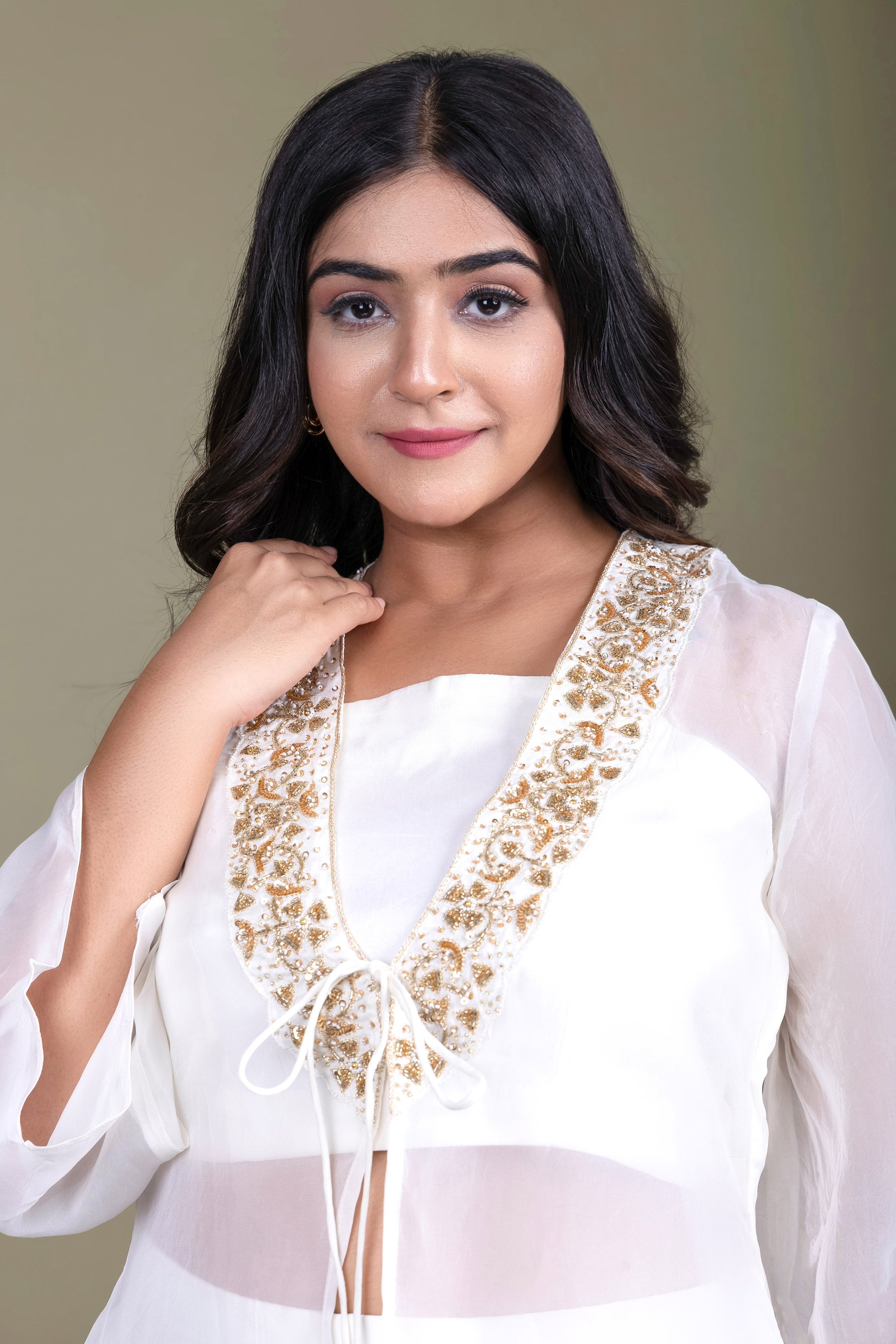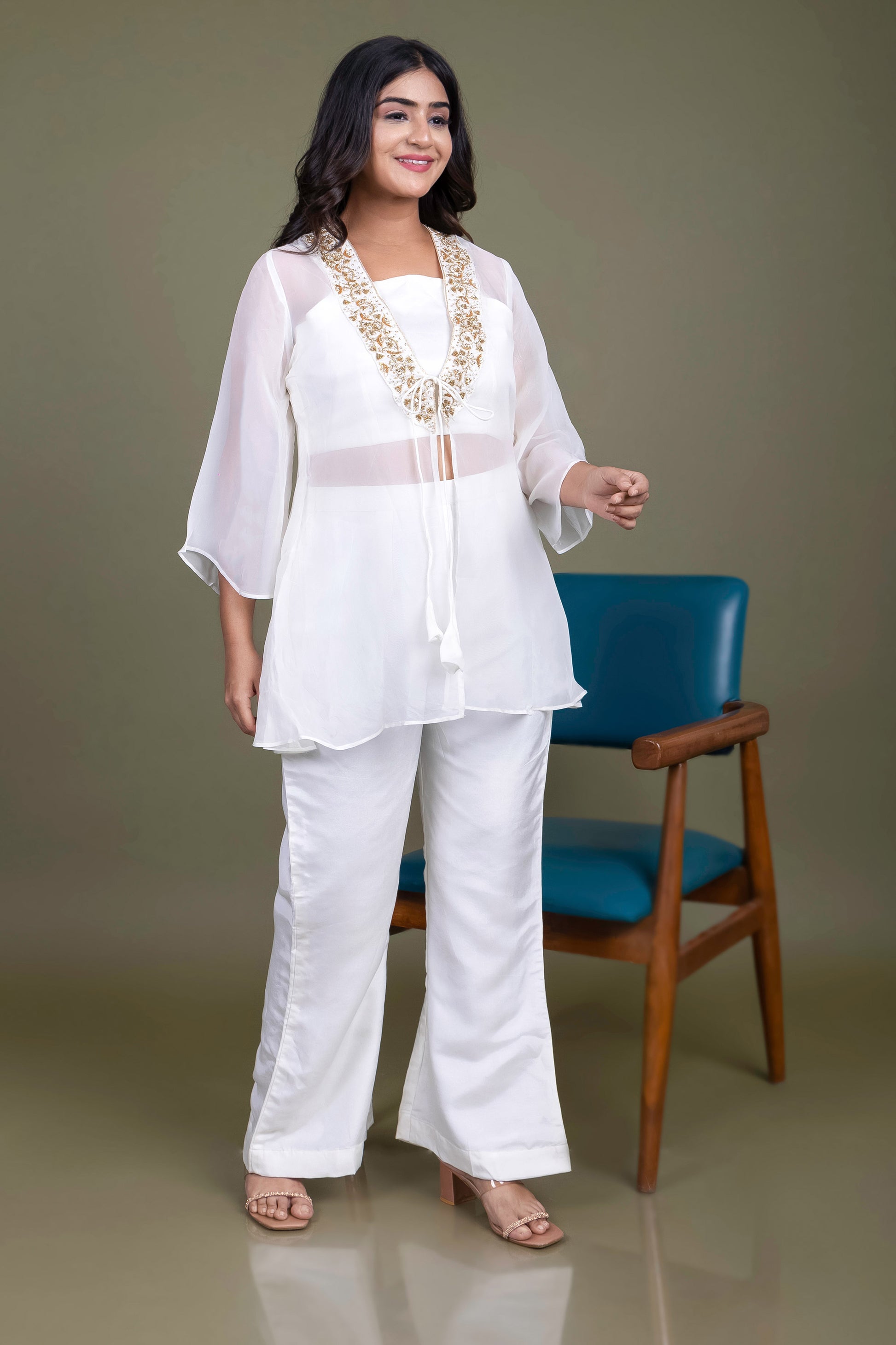 Tarz's Cream Croptop with Palazzo and Embroidered Short Jacket