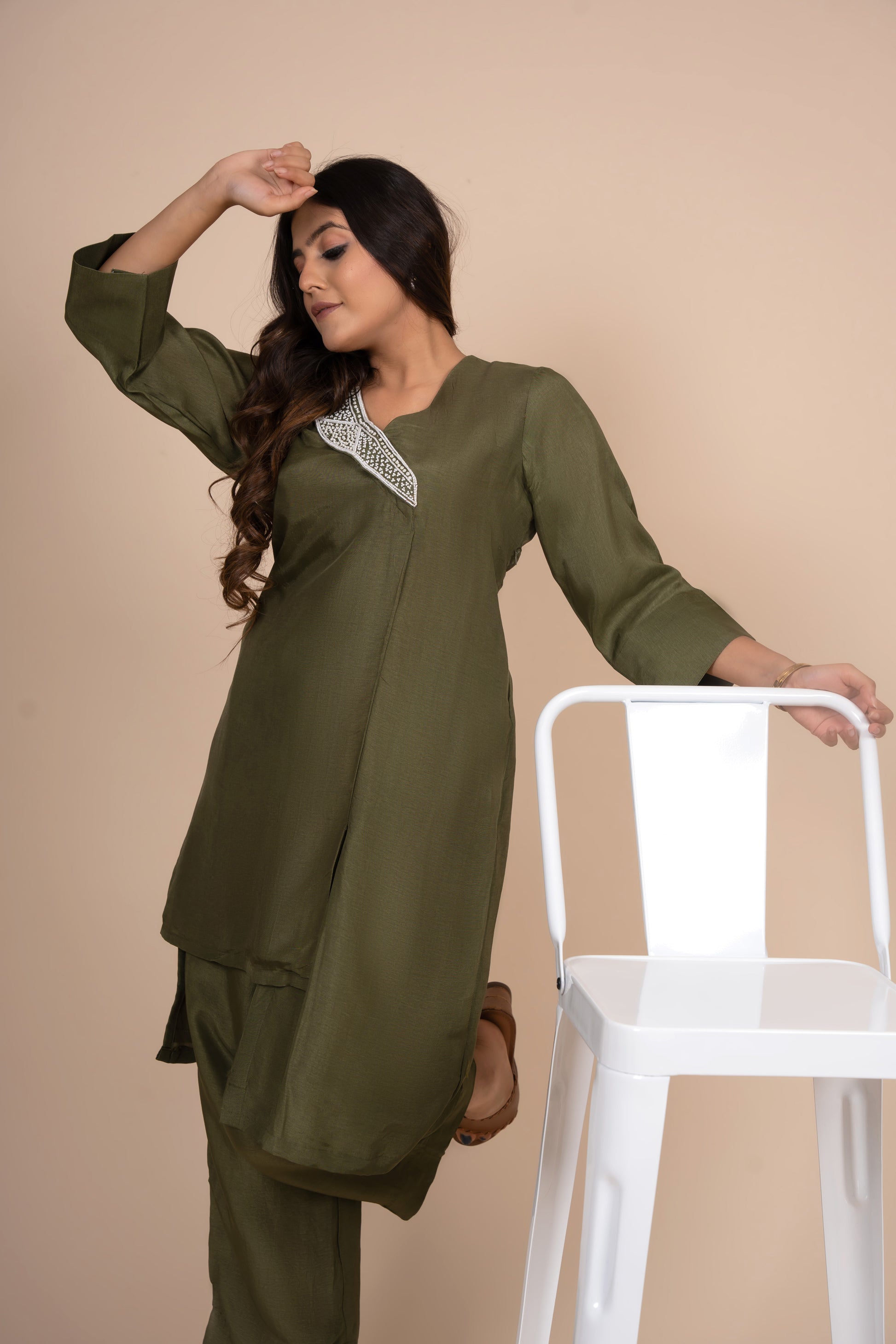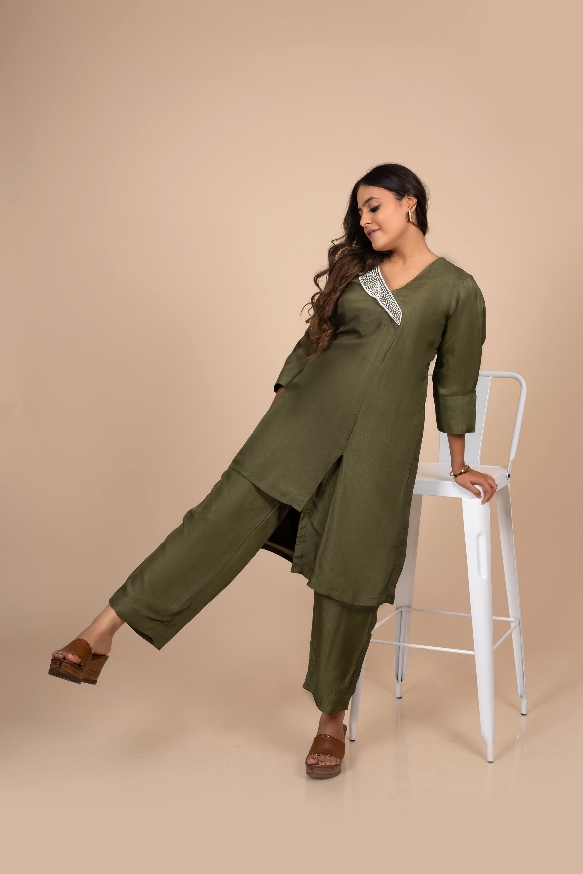 Tarz's Leaf Green one side collar embroidered co-ord set