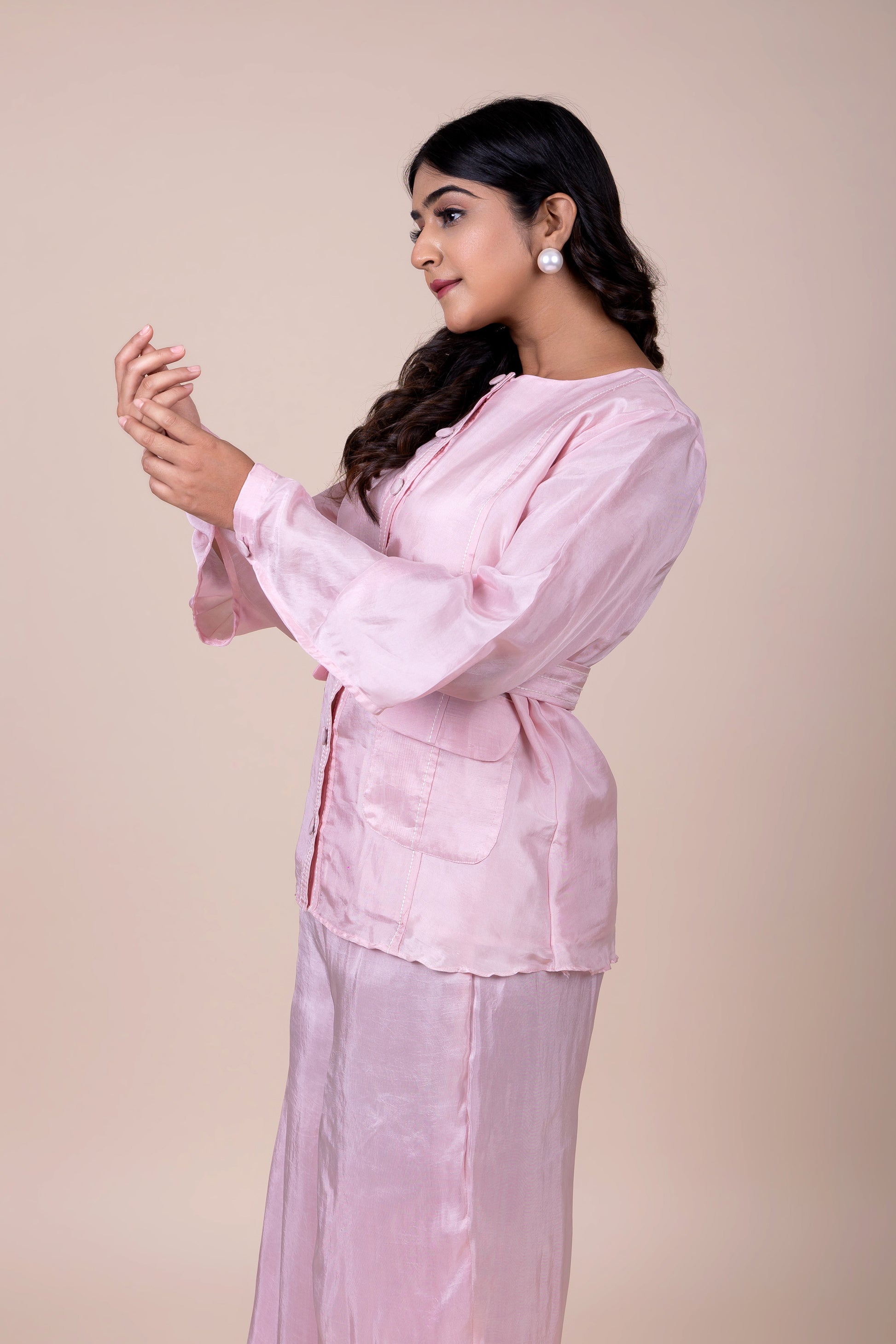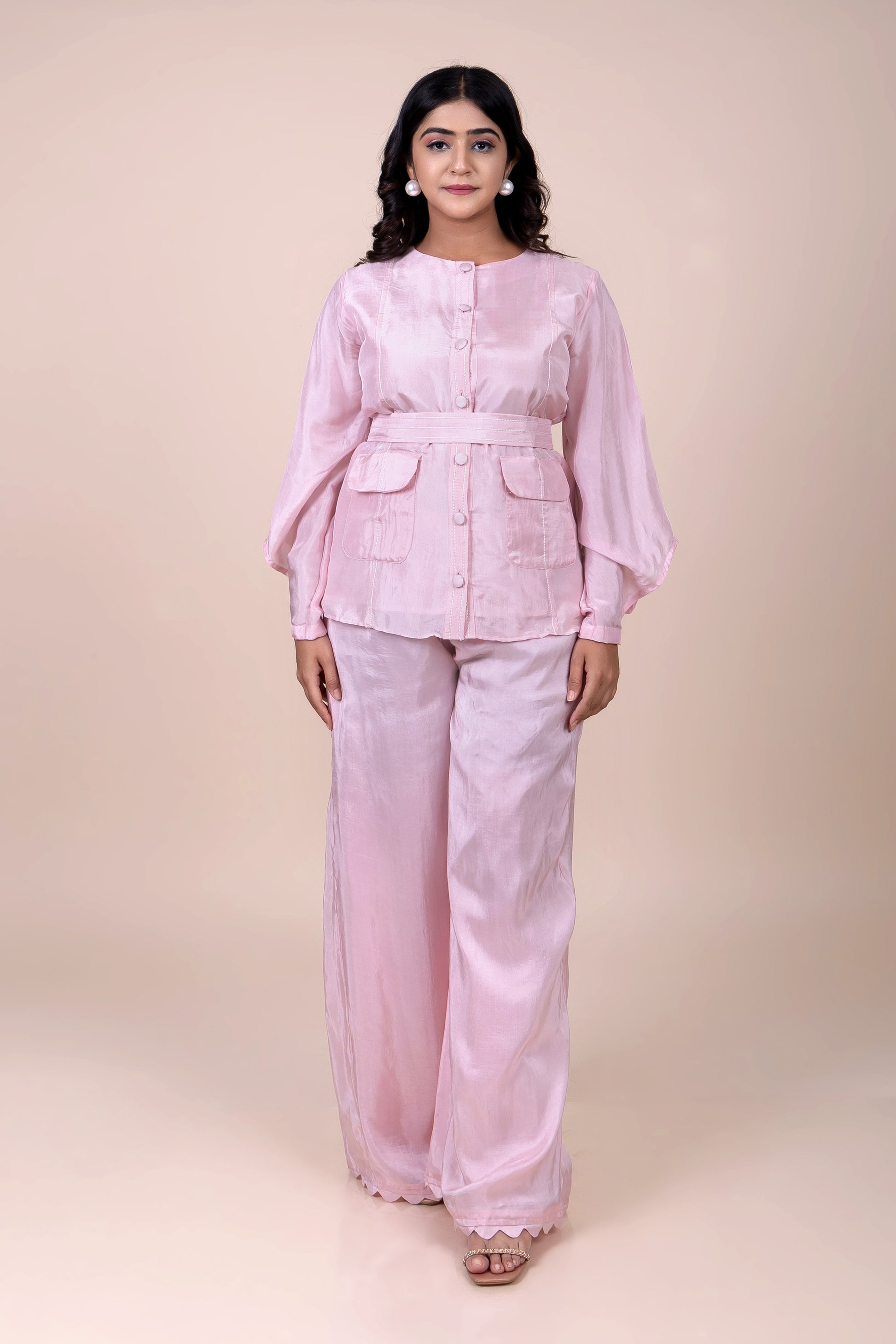 This chic pink co-ord set exudes a blend of elegance and modern style. The top features intricate thread anchoring, adding a touch of detailed craftsmanship and visual interest. Complementing the top is a matching belt, also adorned with thread anchoring, which cinches the waist for a flattering silhouette. This coordinated ensemble is perfect for making a sophisticated statement with its cohesive design and meticulous detailing.