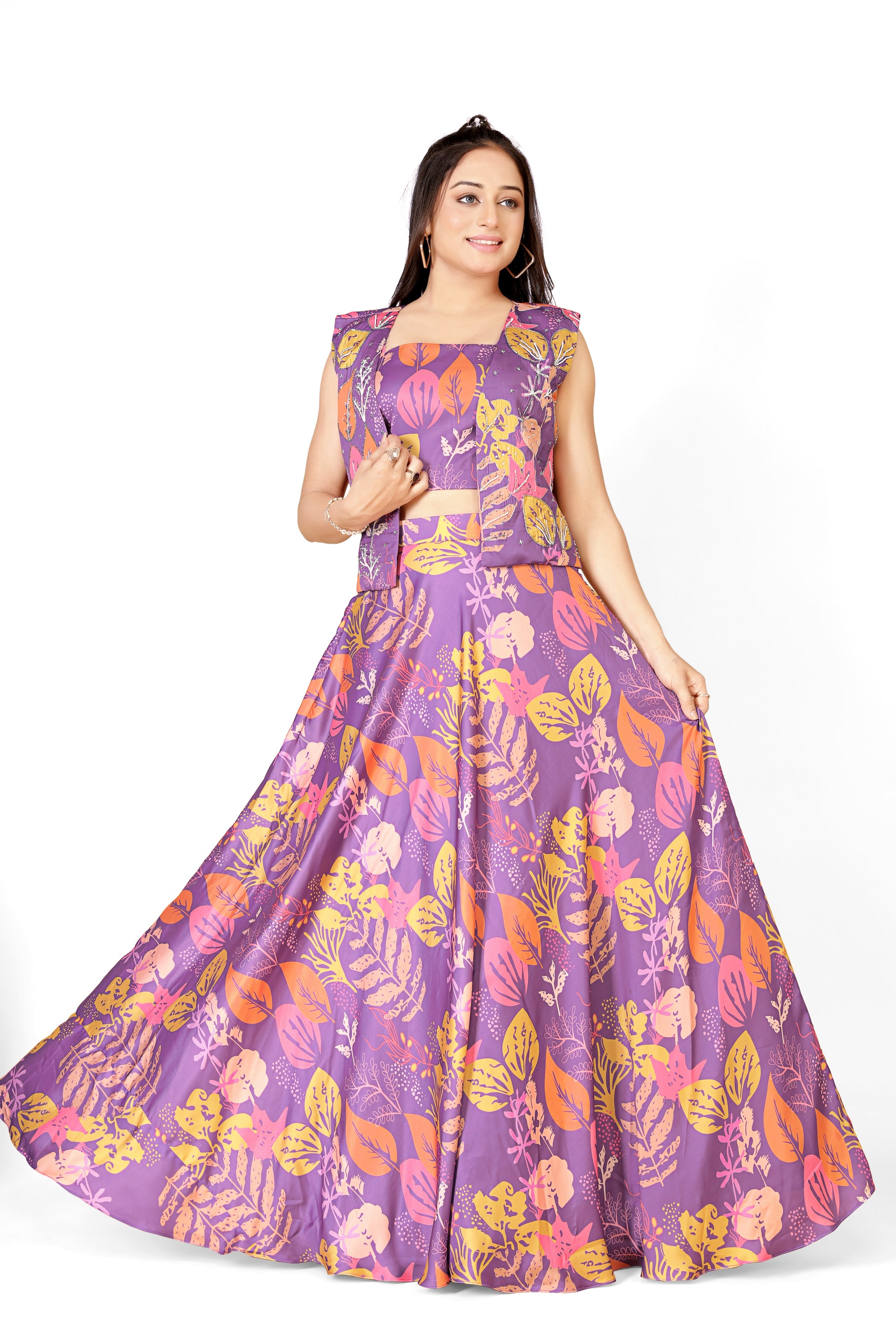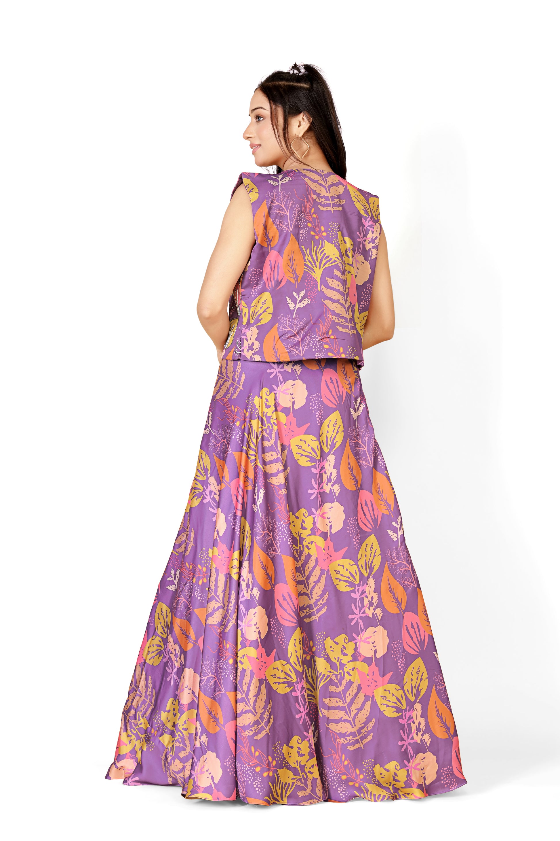 Tarz's Purple Floral Skirt Croptop With Jacket Embellished with hand embroidery