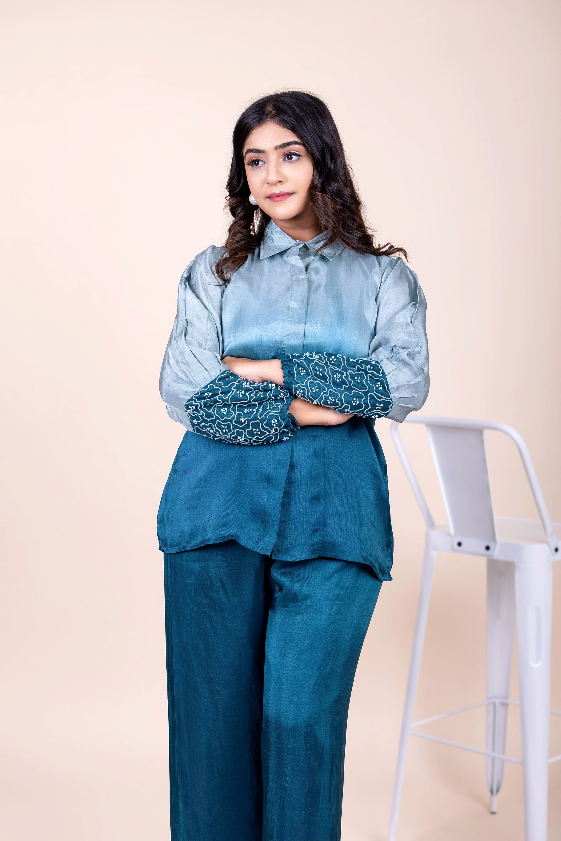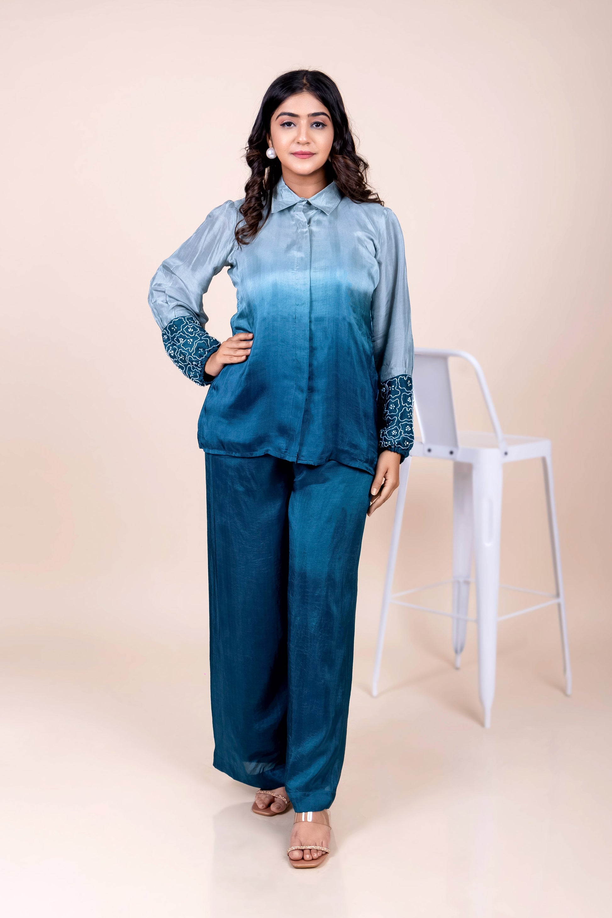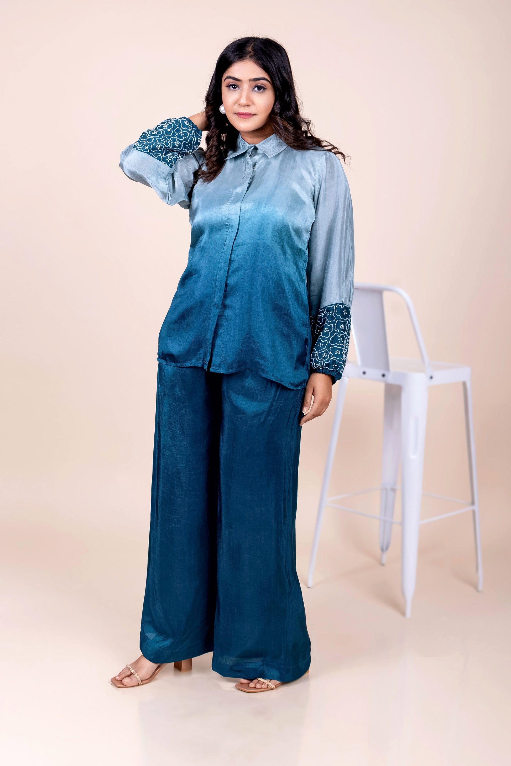 This chic cord set features a stylish shaded shirt paired with sleek straight palazzo pants. The shirt stands out with its fashionable balloon sleeves, beautifully adorned with intricate embroidery, adding a touch of elegance and artistic flair. Its shaded design creates a sophisticated gradient effect, perfect for making a statement. The straight palazzo pants offer a comfortable yet polished look, with a tailored fit that complements the flowy silhouette of the