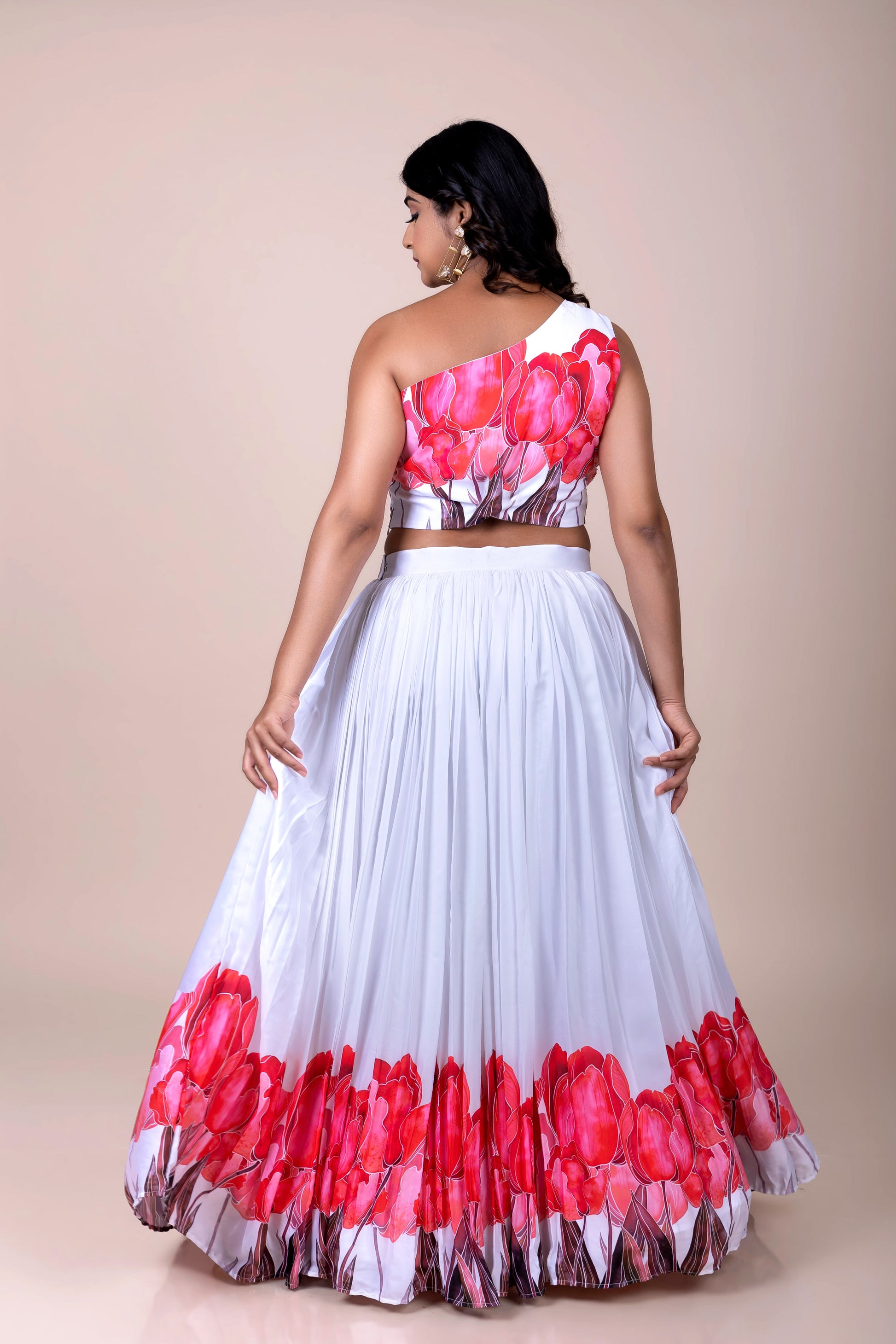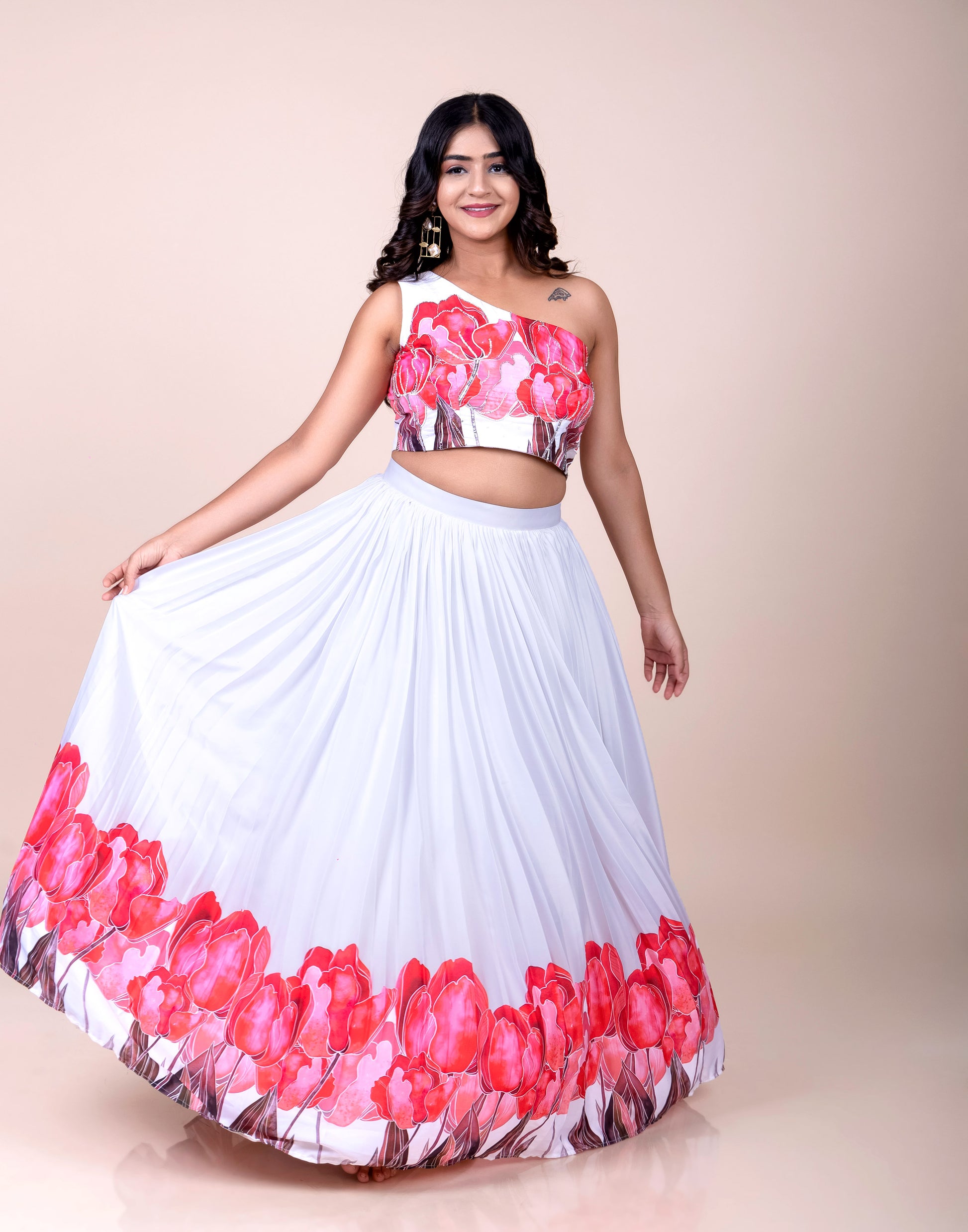 The outfit features a printed white skirt that is elegantly adorned with a floral print on the hemline, creating a fresh and romantic look. This pleated skirt is beautifully paired with a one-shoulder blouse that is highlighted by intricate hand embroidery. The combination of the delicate floral details on the skirt and the exquisite embroidery on the top creates a harmonious blend of elegance and sophistication, perfect for a stylish and chic appearance.